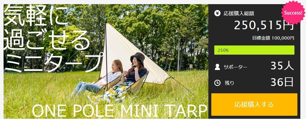 Makuakeで目標率250%達成!日よけが欲しい時!省スペースで気軽につくれるワンポールミニタープ(UPF+50) 一般販売に先駆けて先行販売中!
