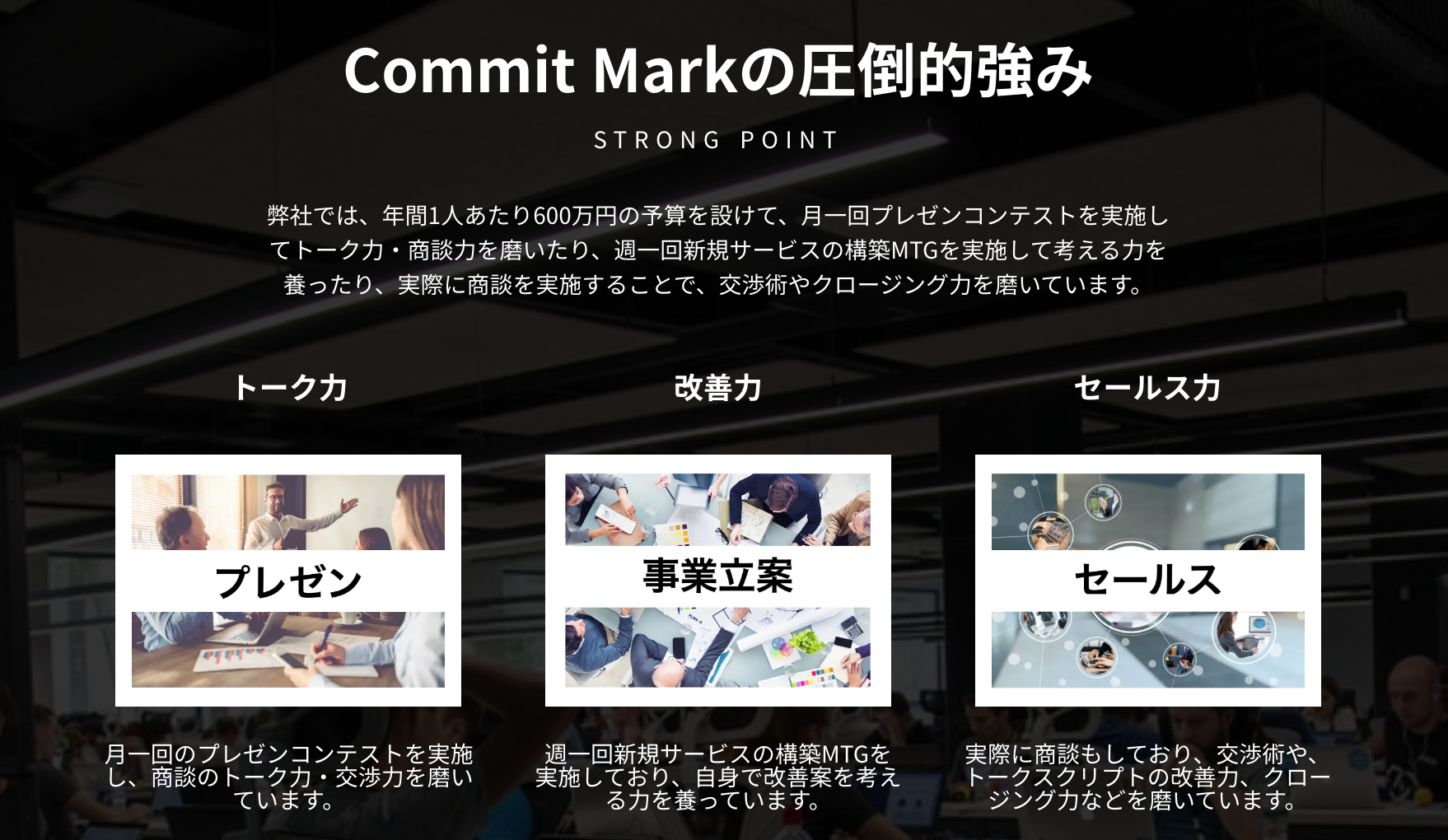 また新規事業立案のサービス構築ミーティングにて改善力を身につけたり、実際にセールスをおこなうことにより交渉術やクロージング力なども磨いております。