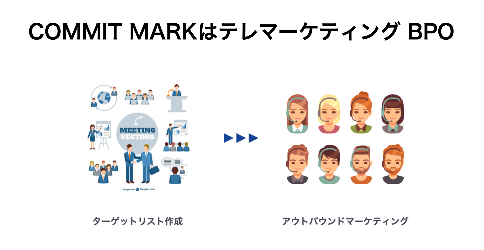 Commit Markは、150万件以上の企業データベースからターゲットを作成、独自のアルゴリズムに基づいて、アウトバウンドコールを実施し、BtoBにおけるリード獲得やアポイントの獲得を提供する、テレマーケティング代行型サービスです。