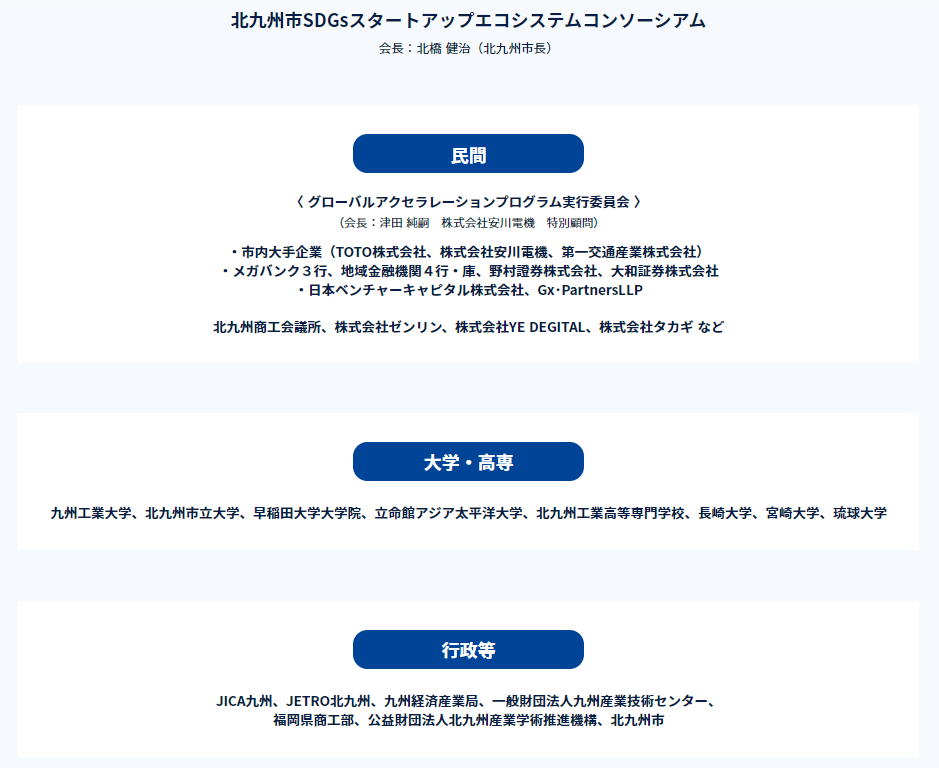 GAP-K実行委員会(会長 津田純嗣㈱安川電機 特別顧問)は、TOTO㈱、㈱安川電機、第一交通産業㈱など地元大企業、金融機関等14社で構成する民間組織であり、「北九州市SDGsスタートアップエコシステムコンソーシアム」※に参画しています。