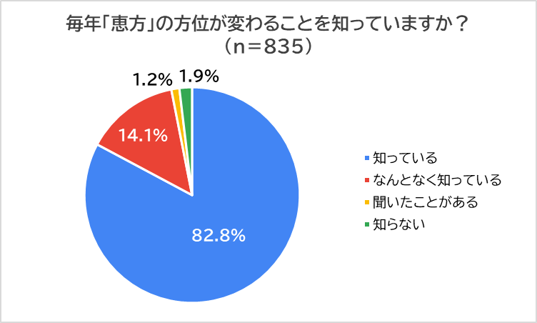「知っている」または「なんとなく知っている」と回答した人に、「恵方」の方位が毎年変わることを知っているか聞いたところ、82.8%もの人が「知っている」と回答。「なんとなく知っている」(14.1%)を含めるとほとんどの人が知っていることもわかりました。