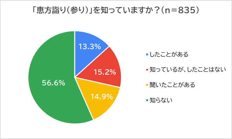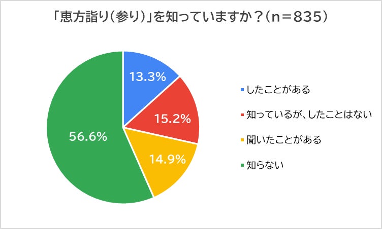 次に「恵方詣り(参り)(※1)」を知っているか聞きました。「知らない」(56.6%)が最多となりましたが、「したことがある」(13.3%)、「知っているが、したことはない」(15.2%)、「聞いたことがある」(14.9%)いました。