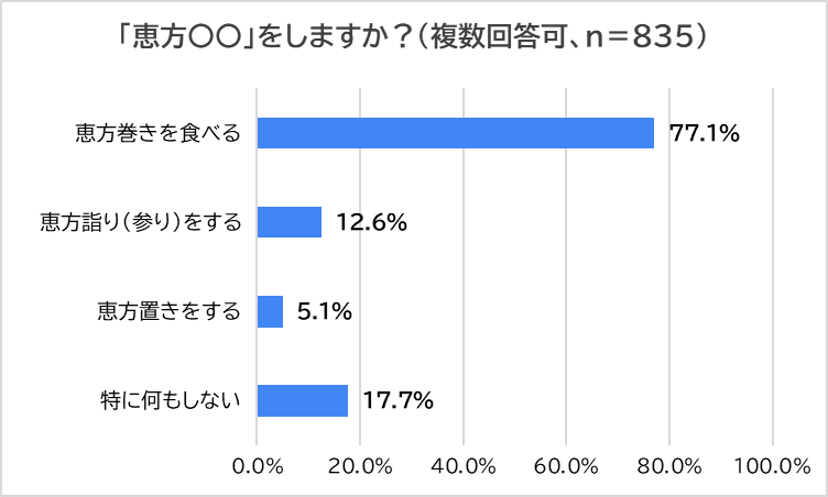 最後に「恵方○○」をするか聞きました。節分の風習として認知されているせいか「恵方巻きを食べる」(77.1%)が断トツで多く、「恵方詣り」(12.6%)、「恵方置きをする」(5.1%)は少数、「特に何もしない」も17.7%いました。