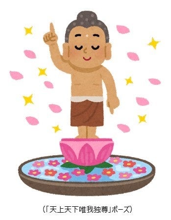 ⑦「天上天下唯我独尊」ポーズをします(右手の人差し指で「天」を、左手の人差し指で「地」を指す。人がいて恥ずかしい時は、胸元でそれぞれ指を指すだけでも可)