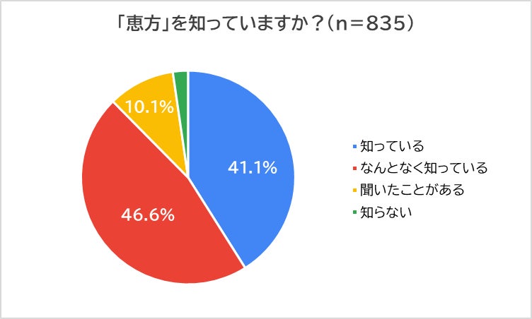 今から30年程前に某コンビニエンスストアのオーナーが、節分に太巻きを食べるという縁起のいい風習を「恵方巻き」として売り出したのが「恵方巻き」の始まりと言われていますが、そもそも「恵方」という言葉は一般的に知られているのか聞いてみました。「知っている」(41.1%)、「なんとなく知っている」(46.6%)、「聞いたことがある」(10.1%)、「知らない」(2.3%)となり、87.7%の人がそれなりに知っていることがわかりました。