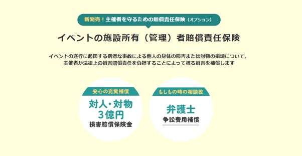 そして今回、新たに賠償責任保険の付帯が可能になったことで、イベント中の不測の事故による賠償リスクにも対応。これにより、イベント主催者の皆さまが、より安心して企画・運営ができるようサポートする新しい保険プランが登場しました。