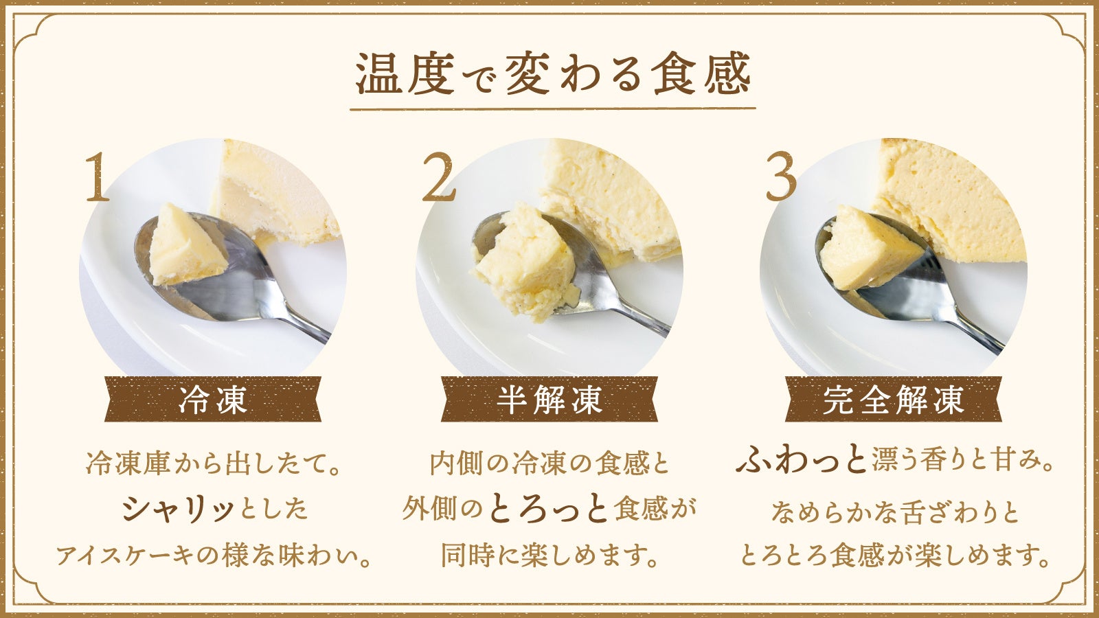 冷凍庫から出したての状態ではシャリッとしたアイスケーキのような味わい、半解凍では内側の冷凍の食感と外側のとろっとした食感が同時に楽しめます。さらに、完全解凍すると、なめらかな舌触りのとろとろした食感に変わります。