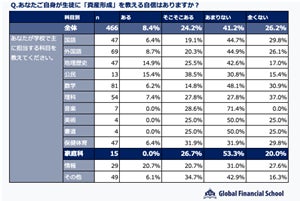 業界最多の講座数を誇る日本最大規模の金融オンラインスクール「グローバルファイナンシャルスクール」(以下略:GFS、東京都港区、市川雄一郎校長)は、2022年度から、高校家庭科で「資産形成」が必修として盛り込まれることに先立ち、高校教育の現場に実際に関わる高校教師がそのことに対してどのような考えを持っているのかを知るため、全国の20〜50代の高校教師466名に、アンケートを実施しました。