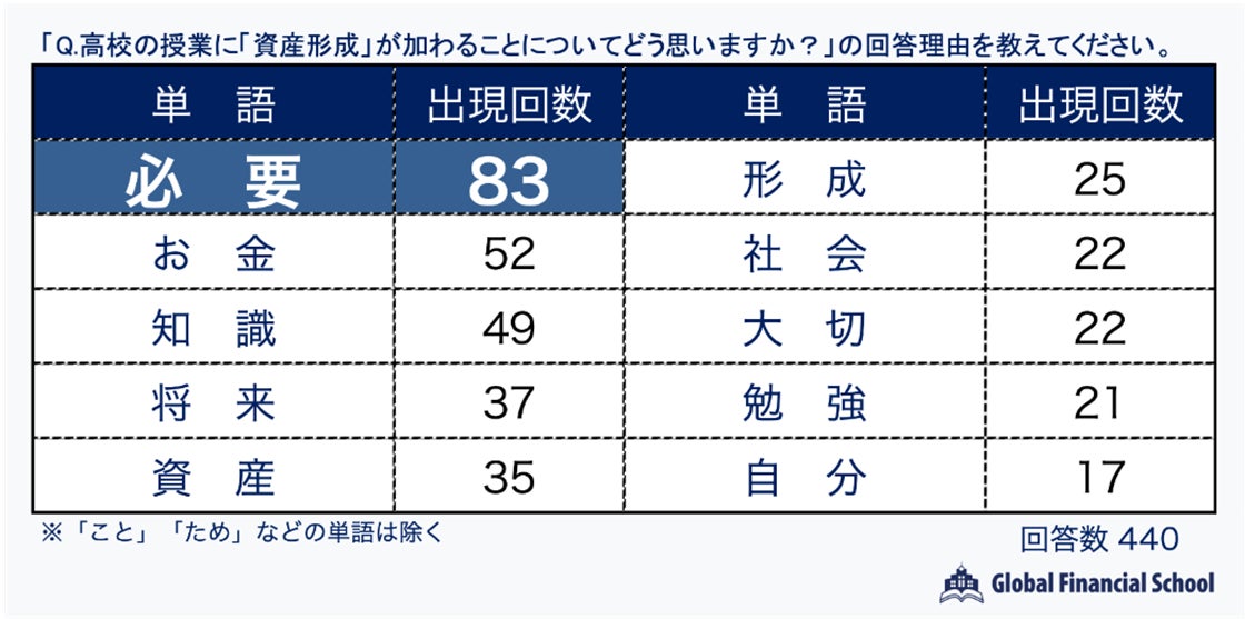 またその理由を聞いたフリーアンサーの出現単語数を計測したところ、「必要」という単語が最も多く出現し、高校教師の中で「資産形成」の授業が“必要”と考えられていることが読み取れました。