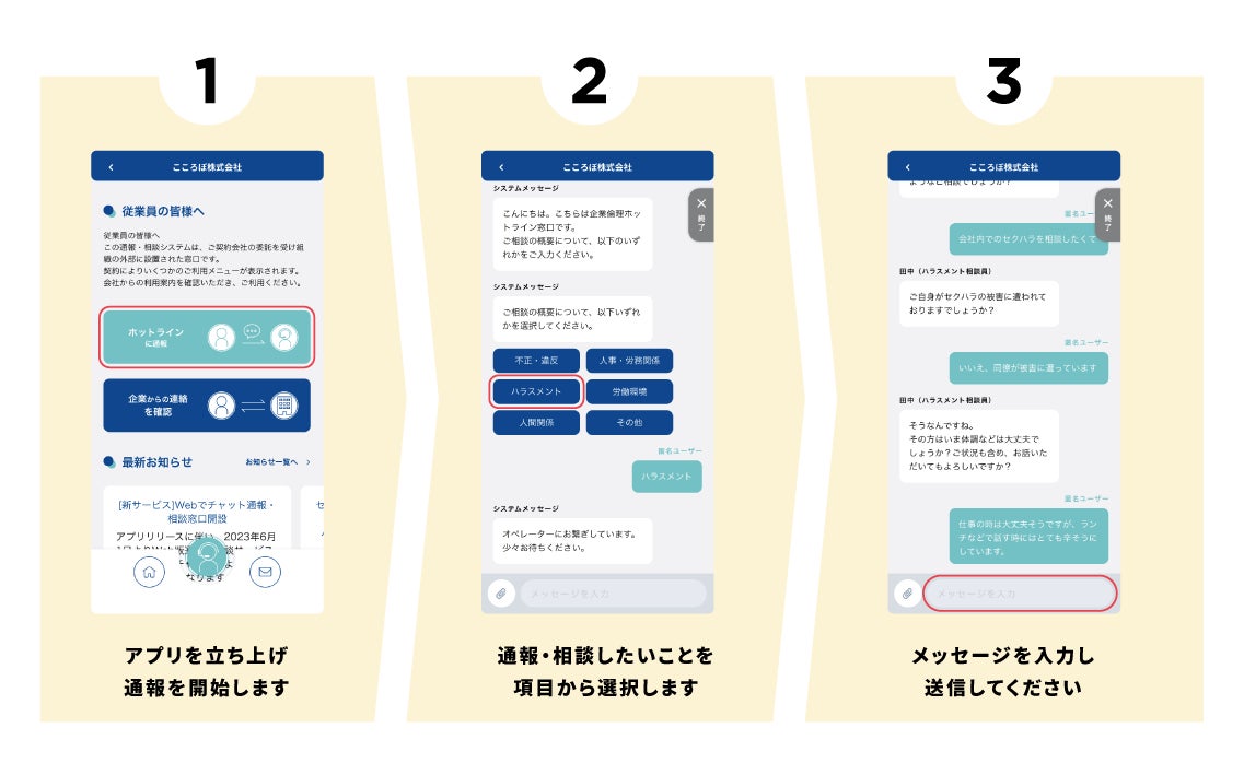 企業や自治体が運営する相談・通報の窓口代行サービスを行うダイヤル・サービス株式会社(本社:東京都千代田区、代表取締役:今野 由梨(こんの ゆり)、以下「ダイヤル・サービス」)は、契約企業の従業員が当社の通報・相談受付者とチャットでやり取りができるアプリ「こころぼ」をリリースいたしました。