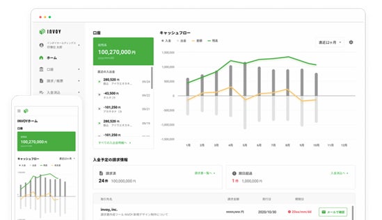 事業者が契約されている預金口座とオンラインで連携し、本サービス上で口座を一括管理できます。自動で入出金明細、残高の口座情報を取得できます。一部有料機能を含み、ご利用にはインターネットバンキングのご契約が別途必要です。