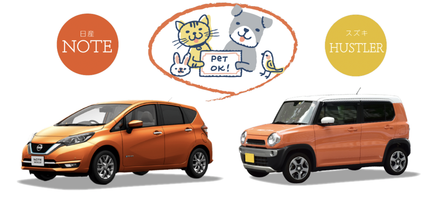 新車種は、スズキのHUSTLER(ハスラー)。これまでご利用いただいていた日産のNOTE(ノート)とともに、ペット同乗可能車両として近場なお出掛けから遠出まで、ペットと一緒に出掛けたいお客様の外出意欲にフレキシブルにお応えいたします。