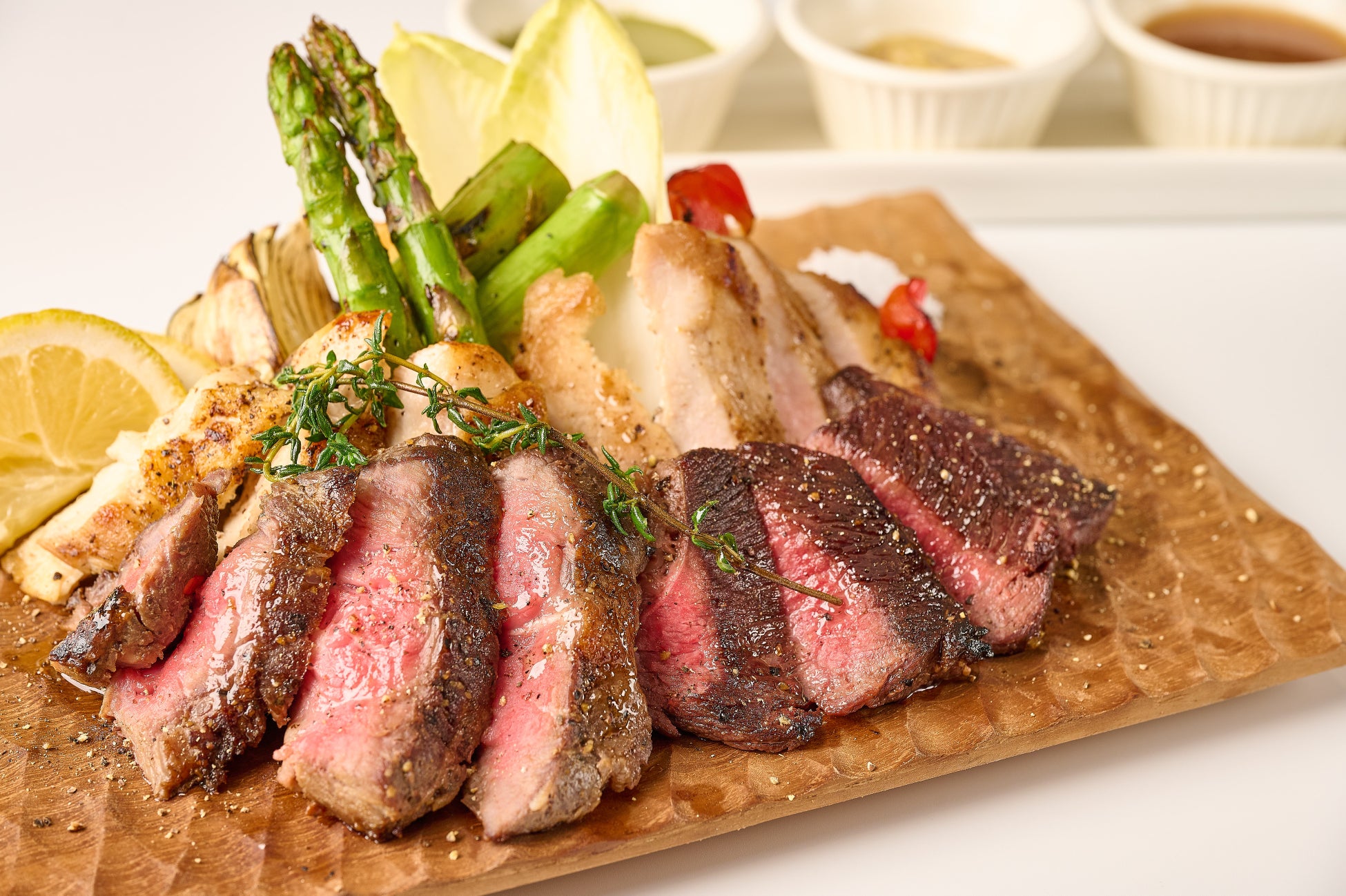 もうひとつのシグネチャーメニューは「ミートプラッター」。当店の一押しである、お肉の旨味をしっかり感じていただけるブラックアンガス牛赤身に数種類のハーブをまとわせ丁寧に焼き上げたビステッカに、グリルチキン、グリルポークを季節のお野菜と共に贅沢な盛合せにいたしました。3種類のソースが肉の旨味を引き出し、ワインとのペアリングもお楽しみいただけます。女子会、ご友人や職場での集まりでのシェアにもぴったりな、ボリューム満点の一品です。