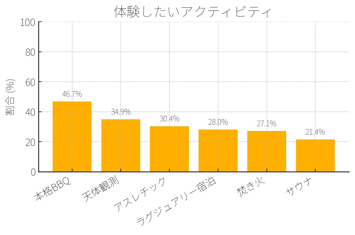 特に注目すべきは「天体観測」の高い人気で、これは都会では味わえない「星空」という自然資源がグランピングの重要な魅力になっていることを示しています。