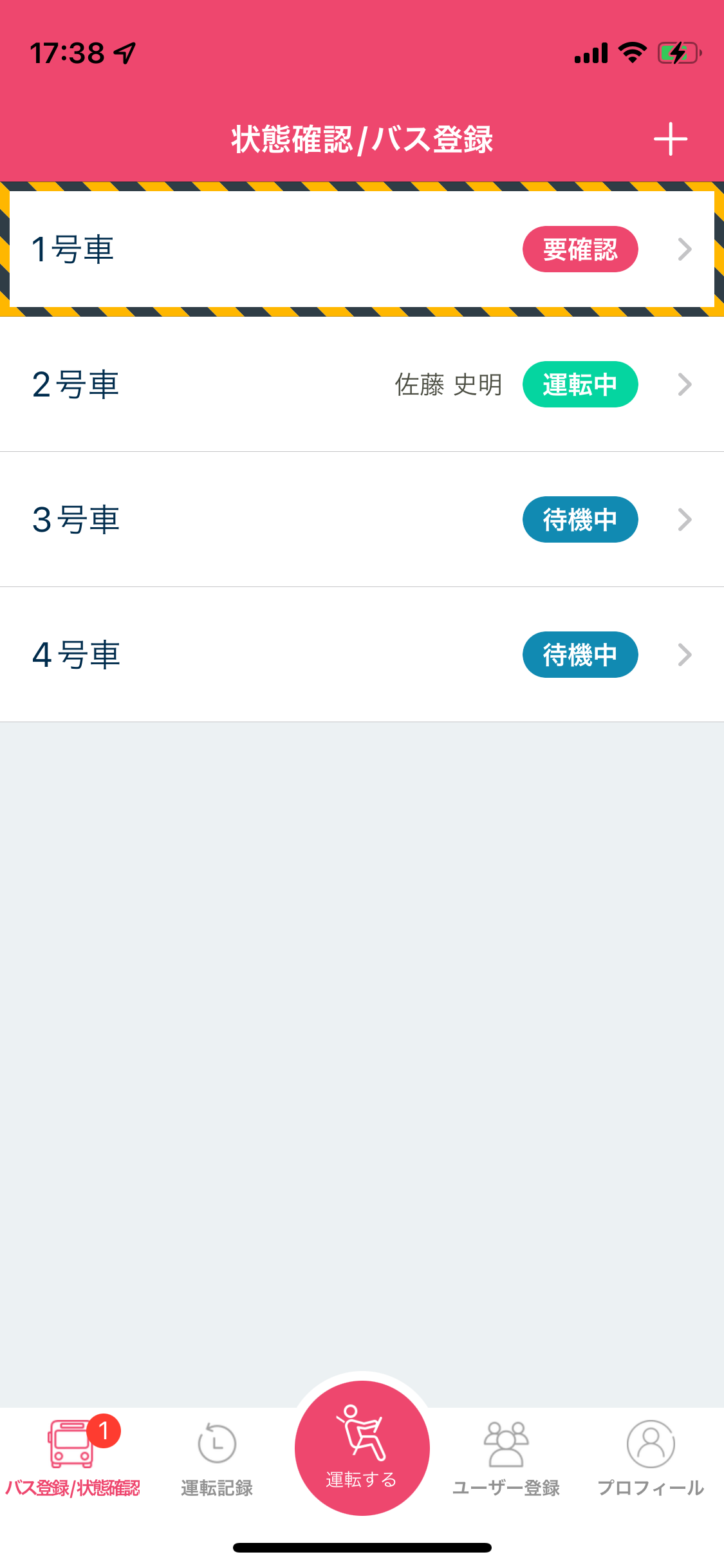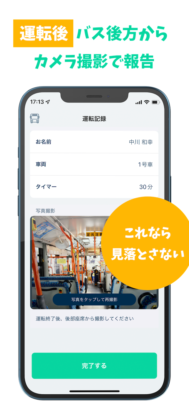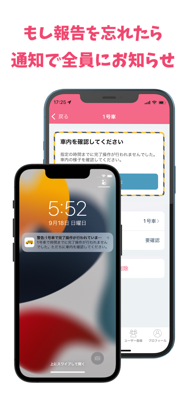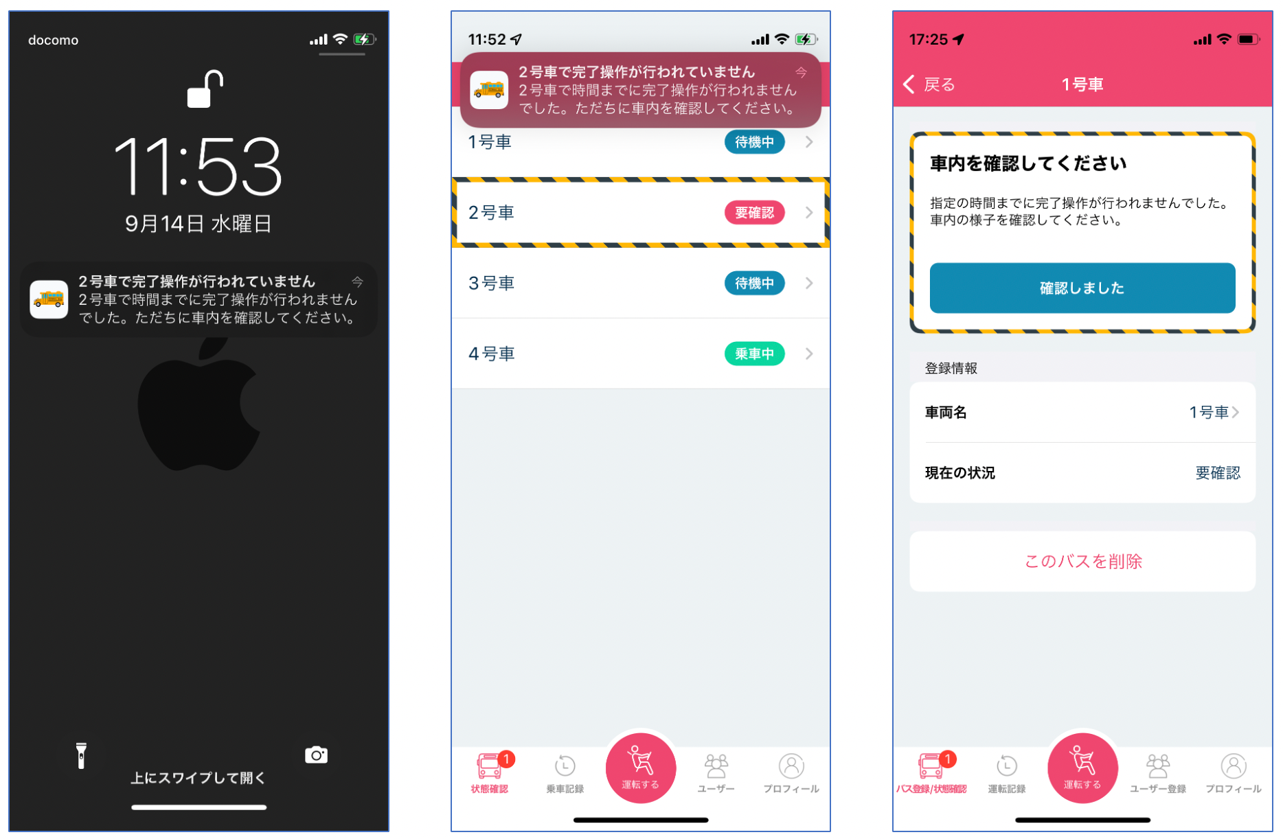 出発ボタンを押した後、設定されたタイマーの時間内に車内の写真が撮影・アップロードされない場合は、どのバスの車内の確認が終わっていないかをつたえる警告が、その団体内の全ユーザー対して通知され、置き去りのリスクを伝えます。
