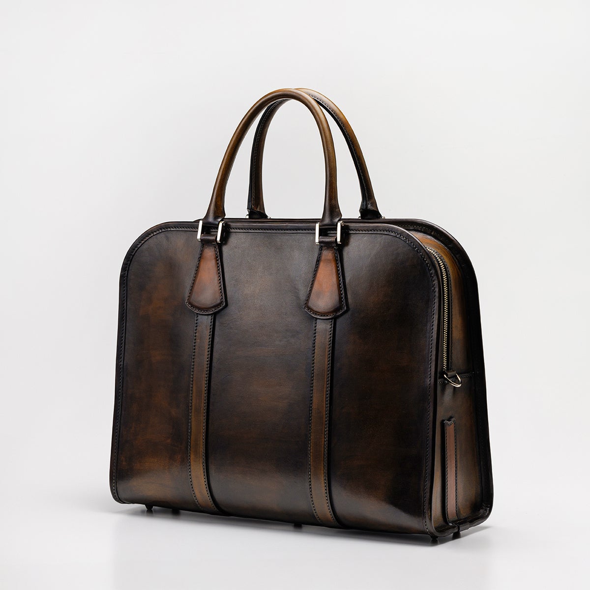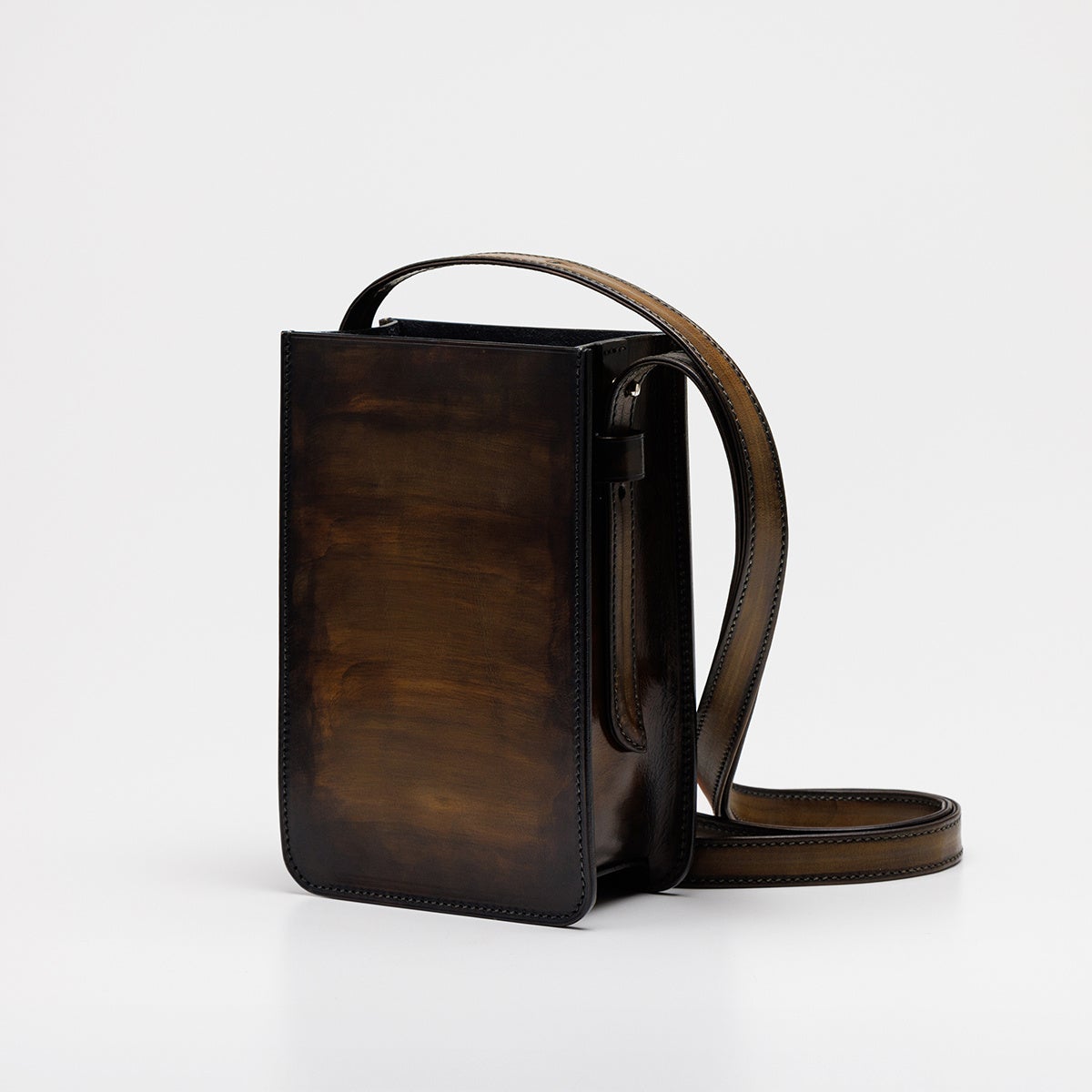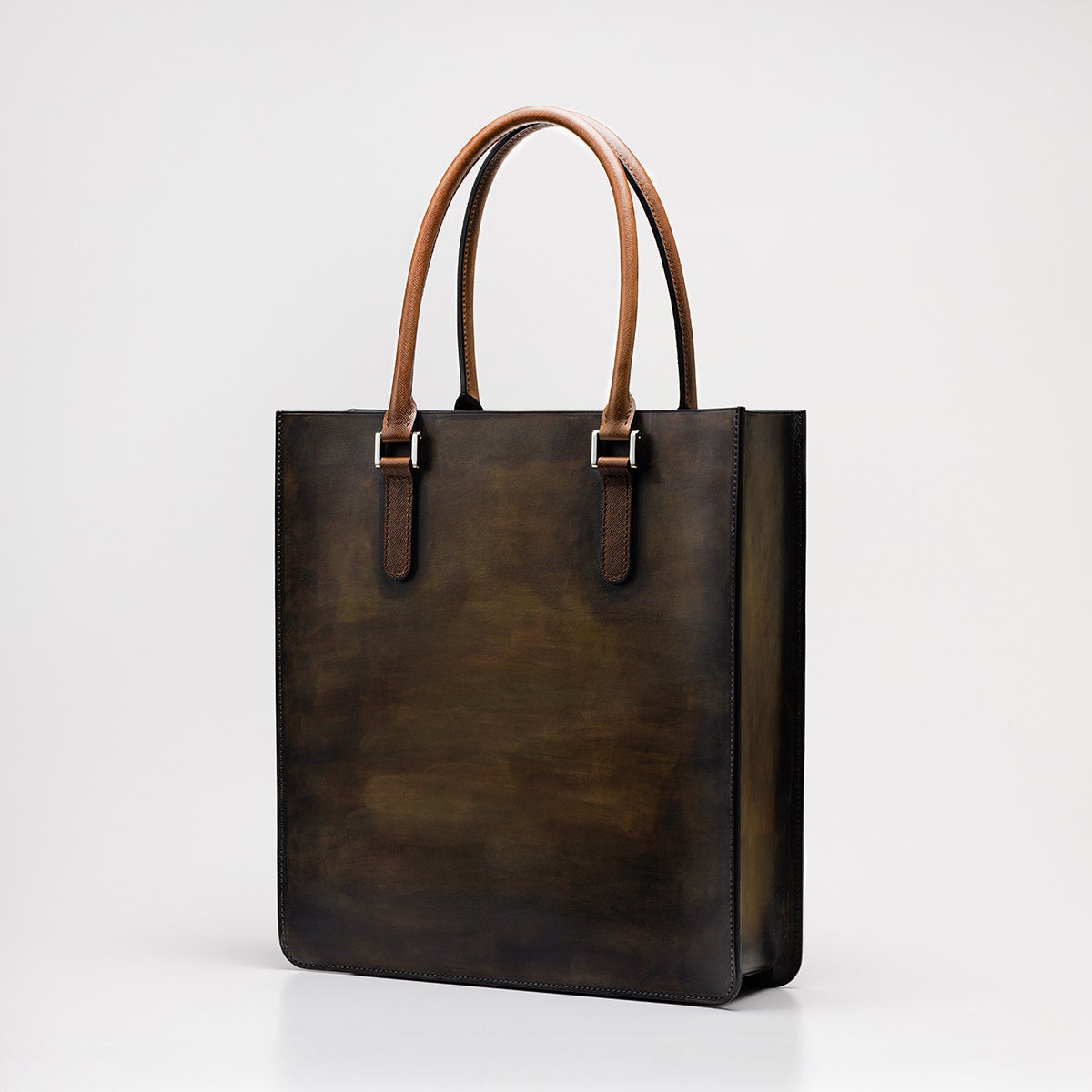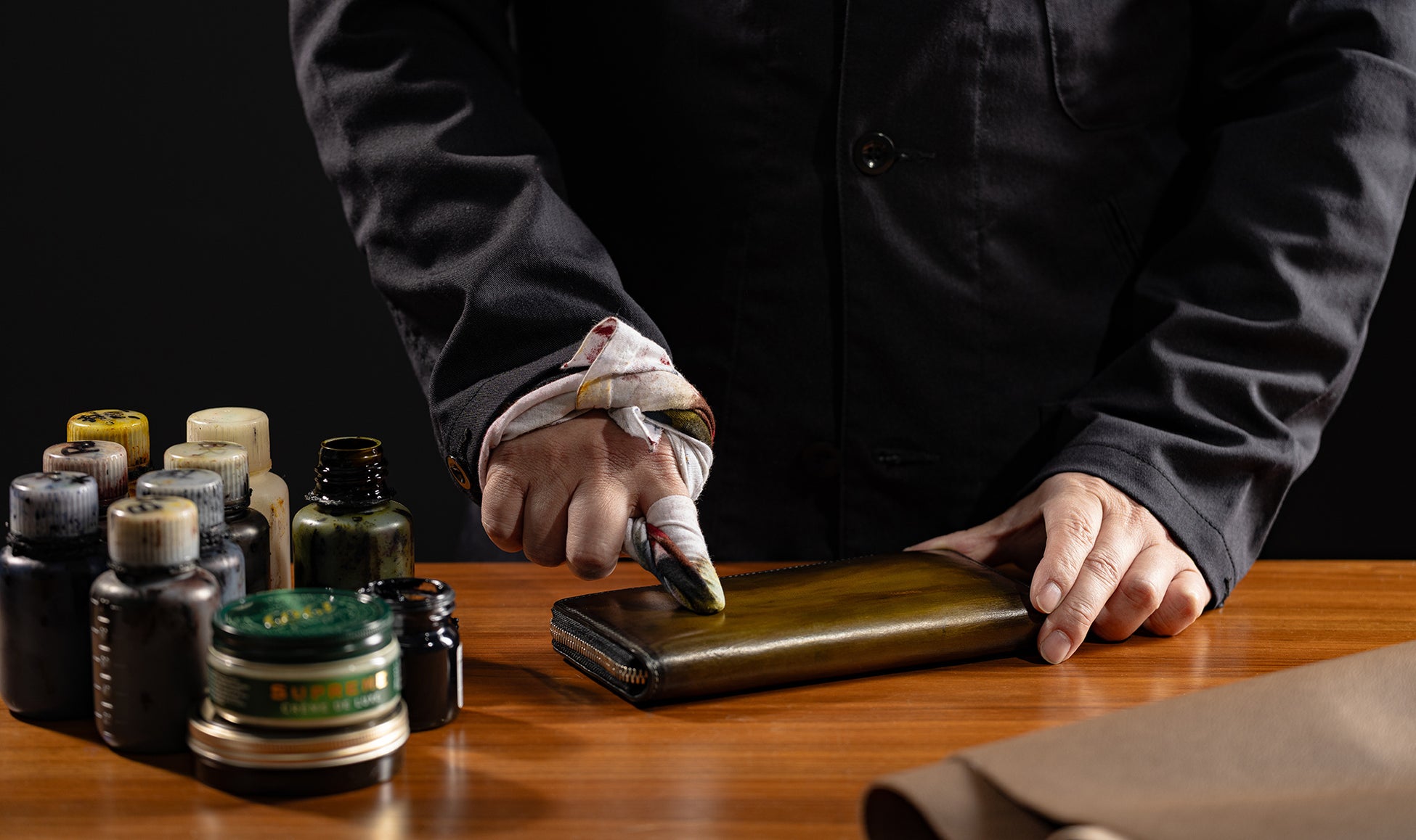ブランドの手染め職人が熟練の技で革を染め上げ、奥深さを表現します。山陽の「ピットヌメ革」は革の繊維の密度が高く、染料が浸透しやすいため、艶や透明感が出やすいのが特徴です。職人の高い技術と相性がいいピットヌメ革の組み合わせにより、唯一無二な色合いに仕上がります。