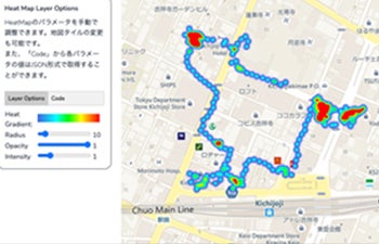 スマートフォンアプリ「CALINT」の位置情報データの軌跡を地図上に可視化することができ、画面上で確認することができます。また、情報データをWEBアプリ上にアップロードして保管・可視化することも可能です。