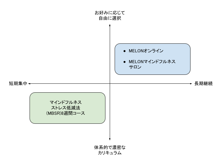 MELONはマインドフルネスのオンラインサービス「MELONオンライン」や、東京・渋谷の「マインドフルネスサロン」などを通じて、マインドフルネスを手軽に継続できる仕組みを提供しています。一方、現代マインドフルネスセンターは、短期集中の「マインドフルネスストレス低減法(MBSR)」8週間コースを国内で提供しています。