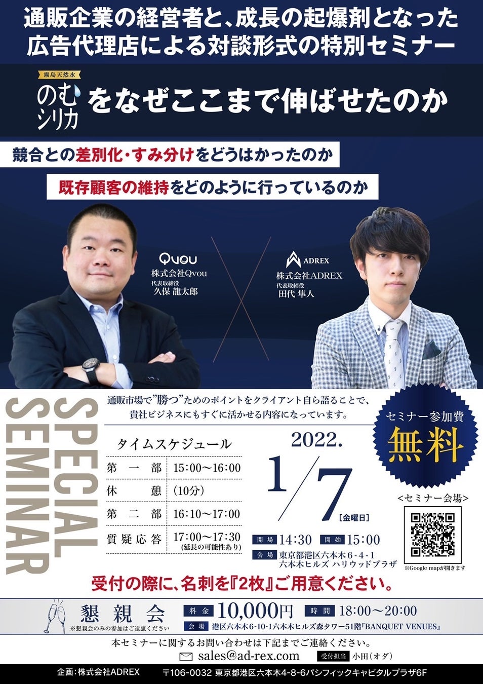 WEB広告業界を席巻するWEBマーケティングのスペシャリスト集団、株式会社ADREX(本社:東京都港区、代表取締役:田代隼人、以下アドレクス)は、株式会社Qvou(本社:東京都渋谷区、代表取締役:久保龍太郎)との共同開催により、<通販市場で“勝つ”WEB広告セミナー>を2022年1月7日(金)に東京都港区六本木、1月14日(金)に福岡県福岡市博多区にて開催することをお知らせします。