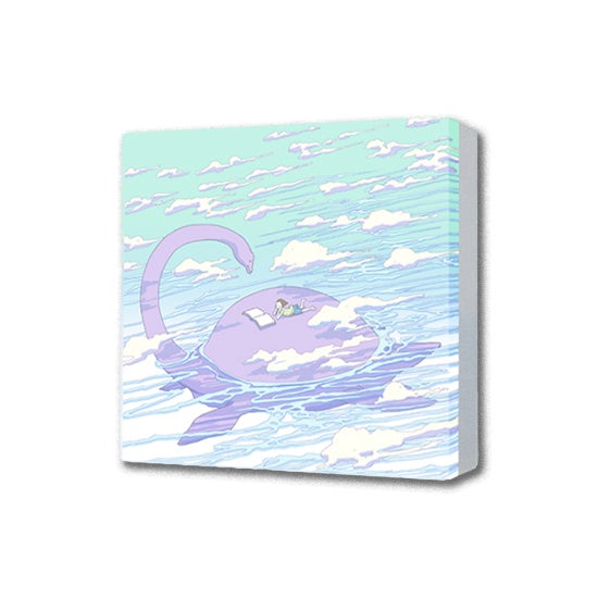 おかざき真里さんによる原画を、キャンバスにダイレクトプリントしたのち、木枠へ固定してお届けいたします。綿化繊のプリント生地を背面でタッカー留めする仕様です。
