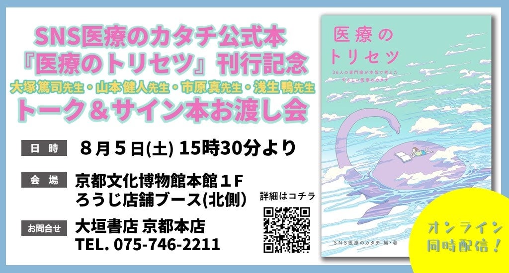 「SNS医療のカタチTV 2023」の開催を記念し、このたび初の同人誌『医療のトリセツ - 36人の専門家が本気で考えたやさしい医療のカタチ - 』を刊行いたします。初の同人誌刊行を記念して、大垣書店京都本店主催でトークイベント&サイン本お渡し会(オンライン同時開催)を開催いたします。