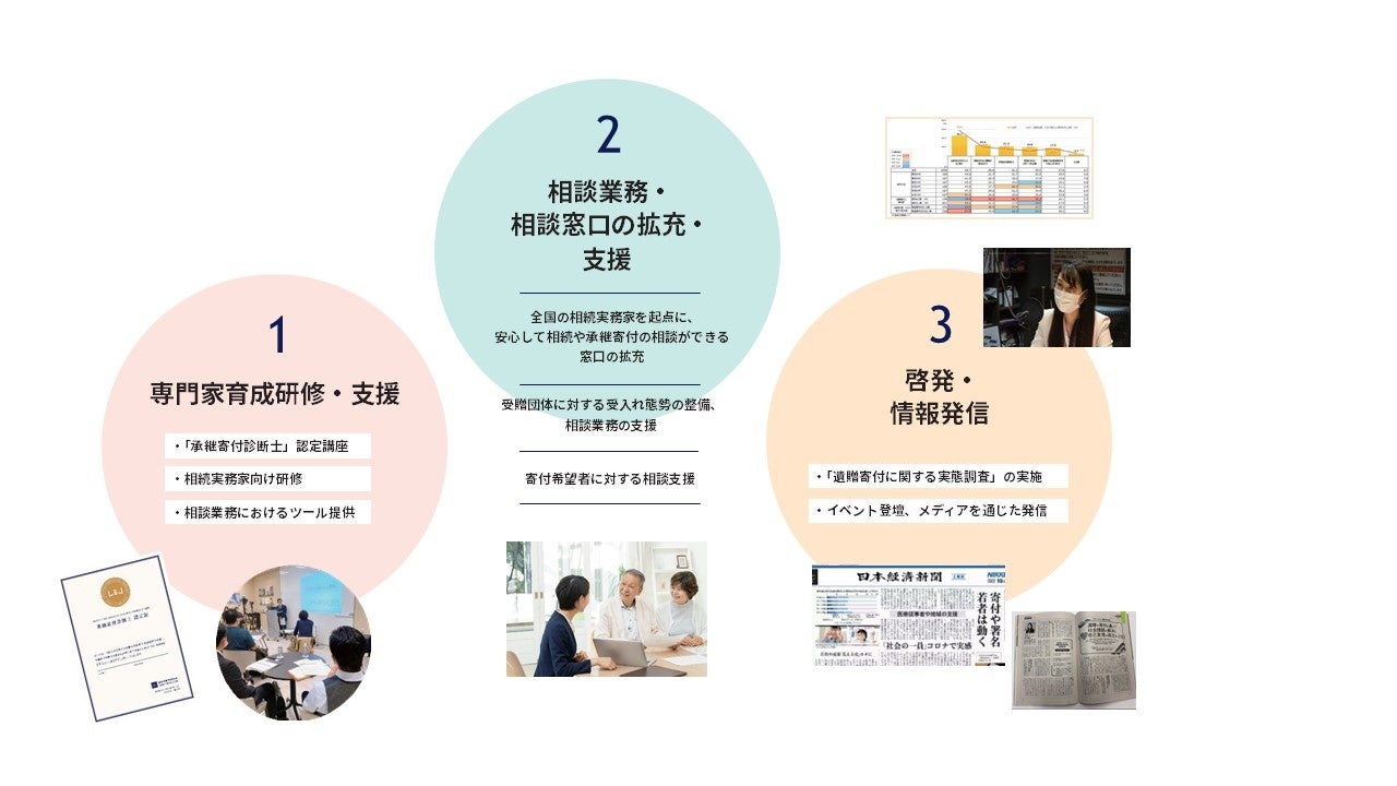 ②相談業務・ 相談窓口の拡充・支援:全国の遺贈寄付を学んだ専門家を起点に、安心して相続や承継寄付の相談ができる窓口の拡充・支援、寄付希望者からの相談業務