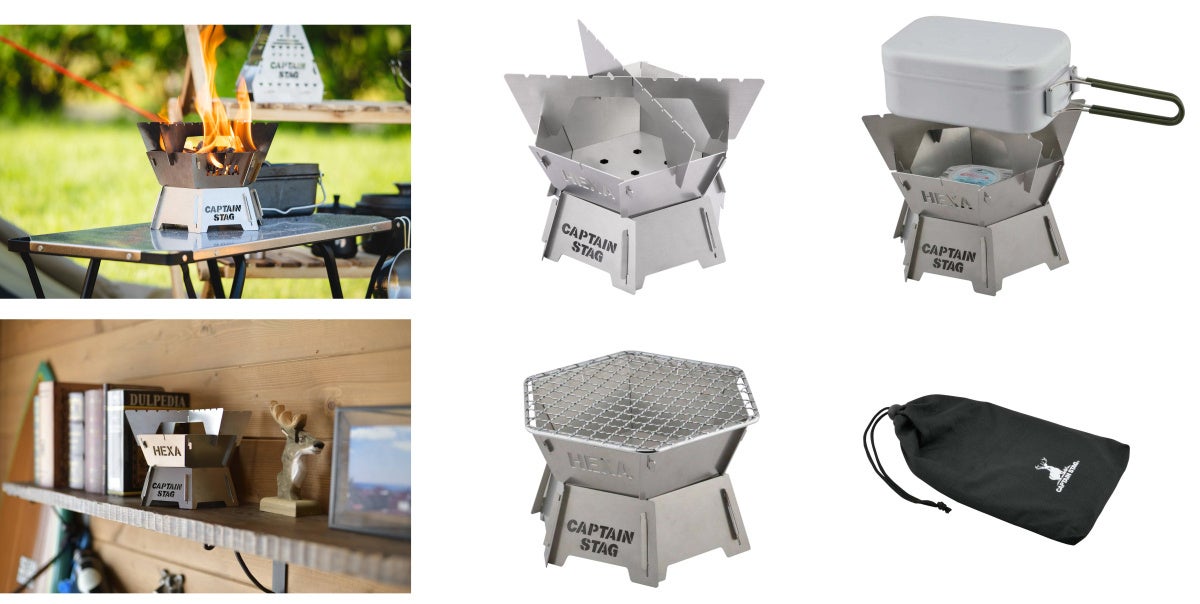 キャプテンスタッグを代表するヘキサ型焚火台のミニタイプ。クロス型の五徳を装備しているので、調理にも適しています。パネル組み立て方式で、薄型収納バック付き。アルコールストーブ、固形燃料用ストーブ、キャンドルスタンドとしても。
