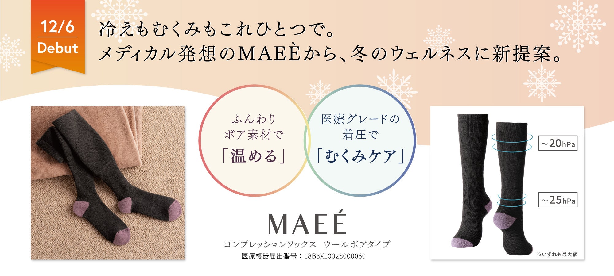 MAEÈでは、メディカルの知見を活かし、「ウールボア素材による温め効果」と、「医療グレードの着圧設計」で血行を促し、からだの機能を高めながら冬のウェルネスを叶える、一般医療機器のソックスを開発いたしました。