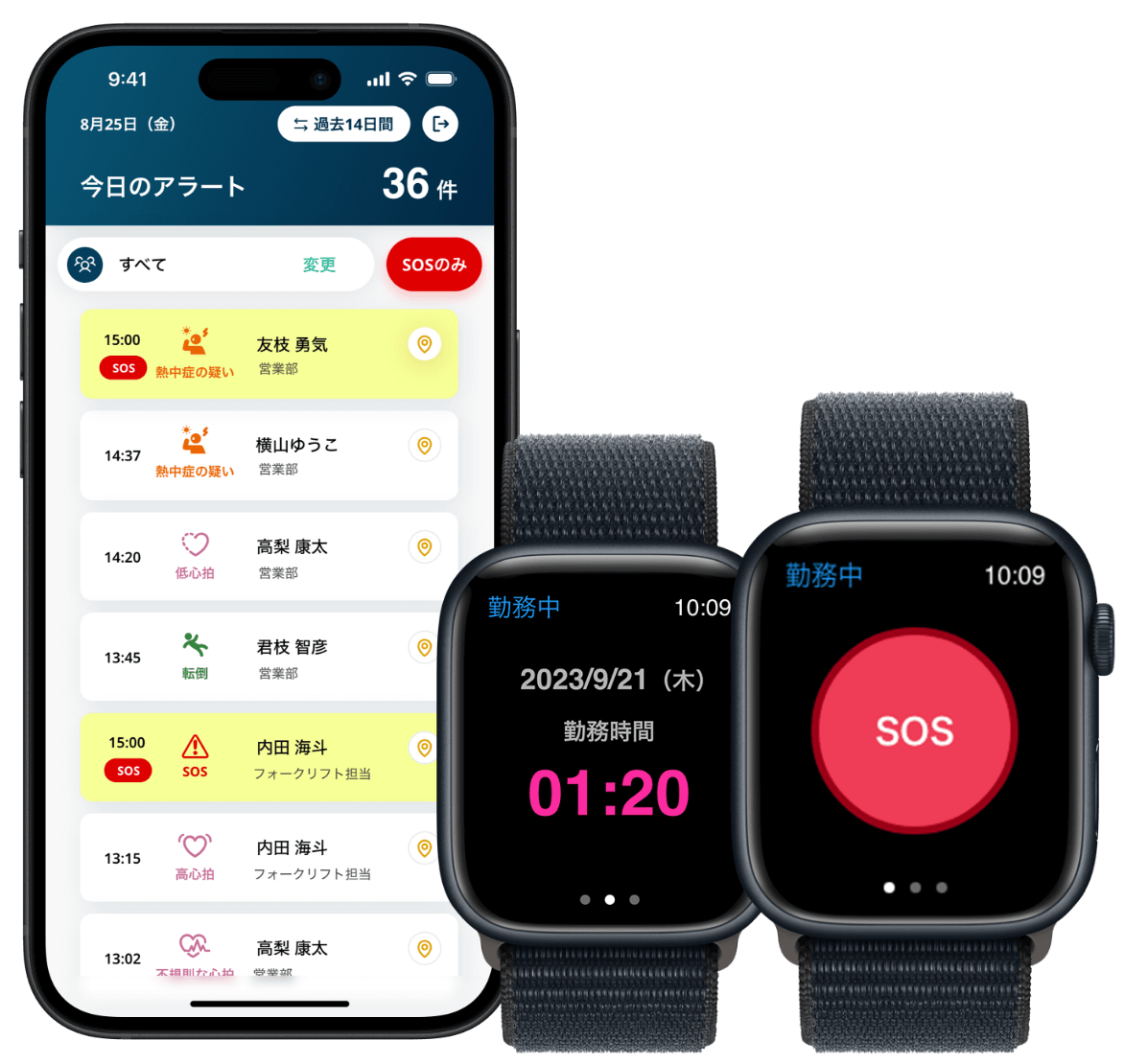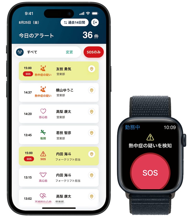 本機能では、従業員が装着するApple Watchから取得したヘルスケアデータを基に、熱中症の疑いを検出します。熱中症の疑いを検出した場合、管理者や周りの従業員にアラートを発信し、熱中症予防に役立てます。
