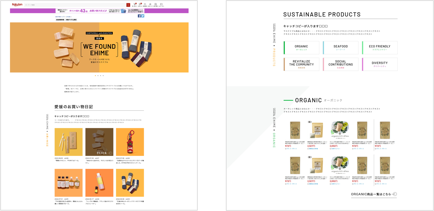 「EARTH MALL with Rakuten」において、“サステナブルなお買い物”をするための8つのキーワードを紹介する「SUSTAINABLE SHOPPING GUIDE」を軸に、愛媛のサステナブルな商品基準を設定。
