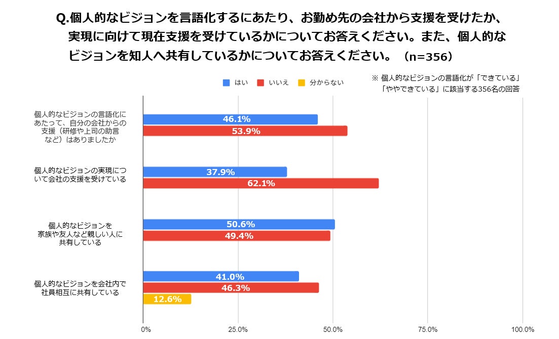 調査を行った結果、個人のビジョンがある人でビジョンの言語化にあたって自分の会社からの支援(研修や上司の助言など)を受けた人は46.1%、ビジョンの実現について会社の支援を受けている人は37.9%という結果になりました。