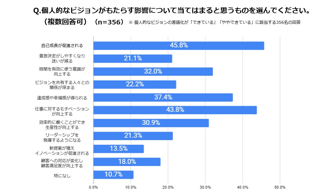 また、個人のビジョンの効用として最も挙げられたものは「自己成長が促進される(45.8%)」。