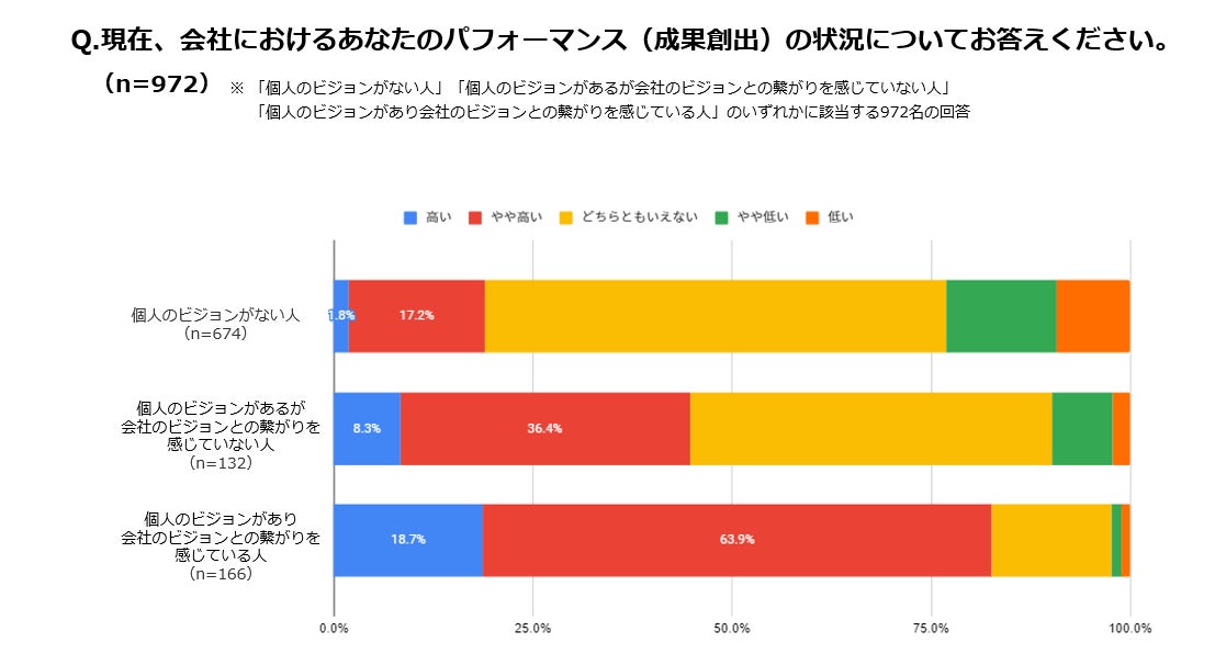 ① 個人のビジョンがある人のパフォーマンスは高い、さらに、個人のビジョンと会社のビジョンに繋がりを感じている人のパフォーマンスはより高い