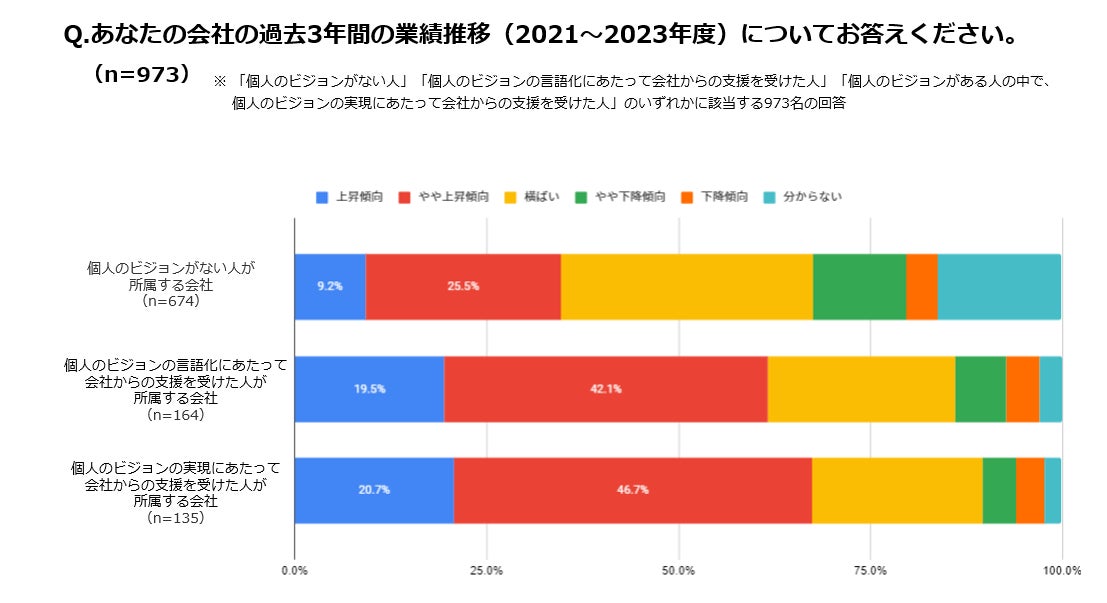 また、個人のビジョンの言語化や実現を支援する会社の過去3年間の業績推移を見てみると、そうではない(個人のビジョンの言語化や実現の支援をしていない)ケースに比べて業績が上昇傾向にあることも分かりました。