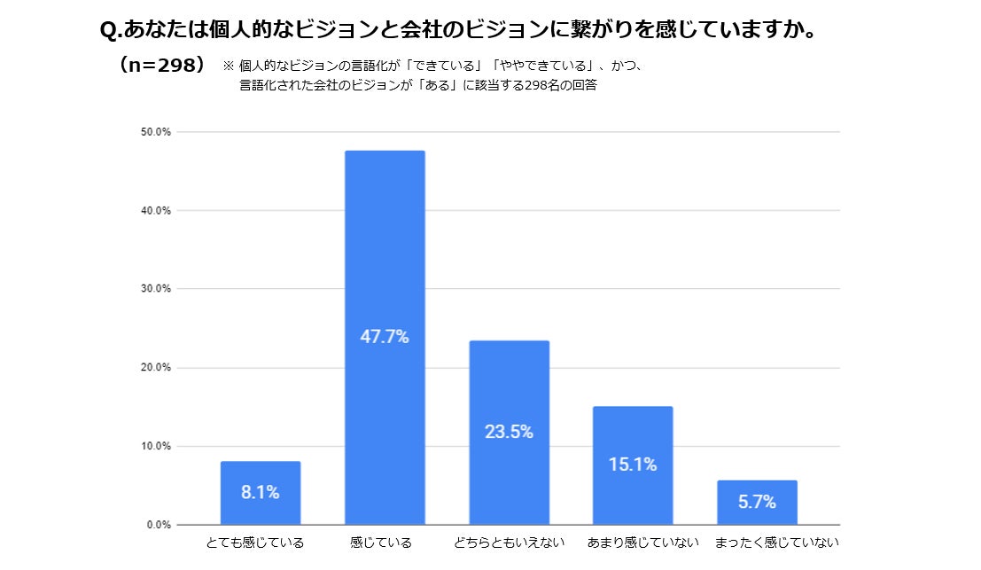 さらに、個人のビジョンがある人に対して会社のビジョンとの繋がりをお聞きしたところ、繋がりを感じている人は55.8%という結果になりました。