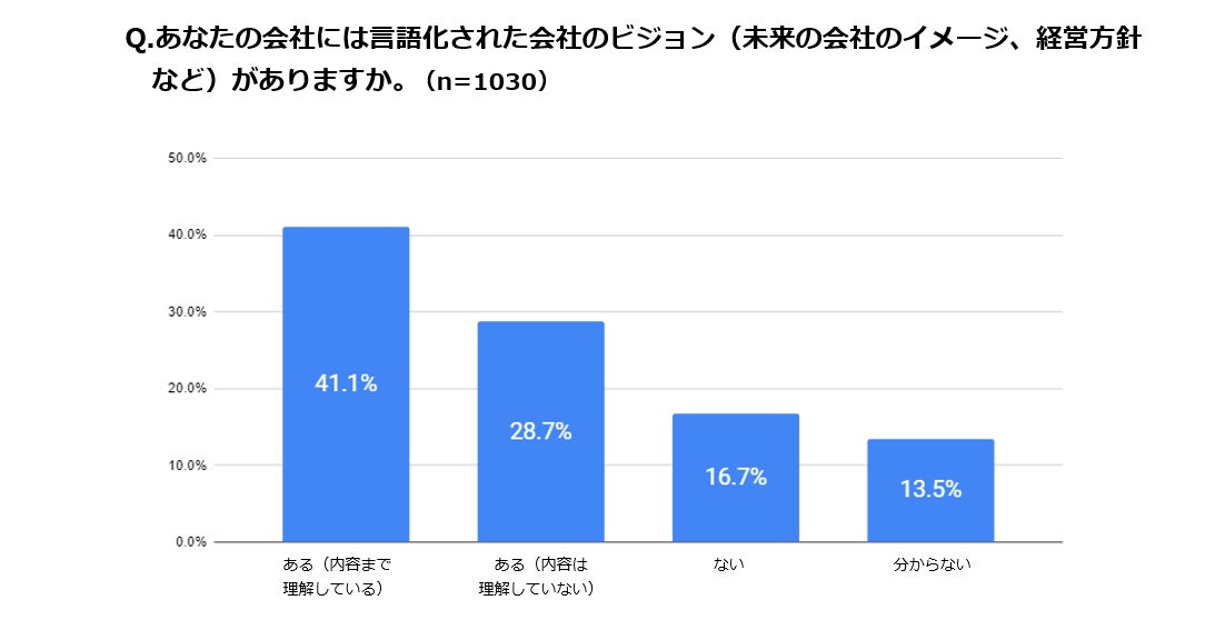 自身が所属する会社に「会社のビジョン」があると回答したは人は69.8%(ビジョンの内容まで理解している人に限定すると41.1%)。