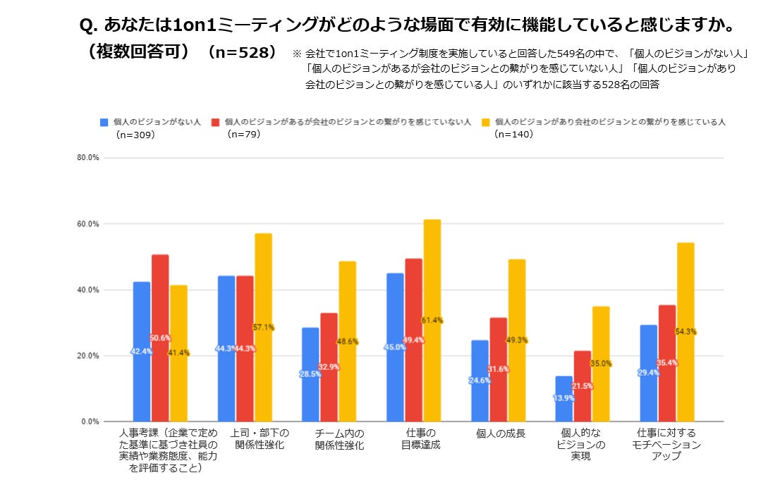 ご覧の通り、個人のビジョンがある方が、様々な要素において1on1ミーティングの価値を感じている結果となりました。特に、個人のビジョンがあり会社のビジョンとの繋がりを感じている場合はその傾向が顕著です。