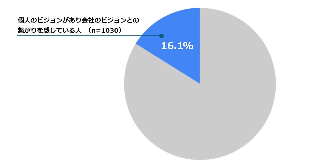 アンケート回答者全体(N=1030)で見ると、「個人のビジョンがあり会社のビジョンとの繋がりを感じている人」の割合は16.1%。約6人に1人に留まっています。