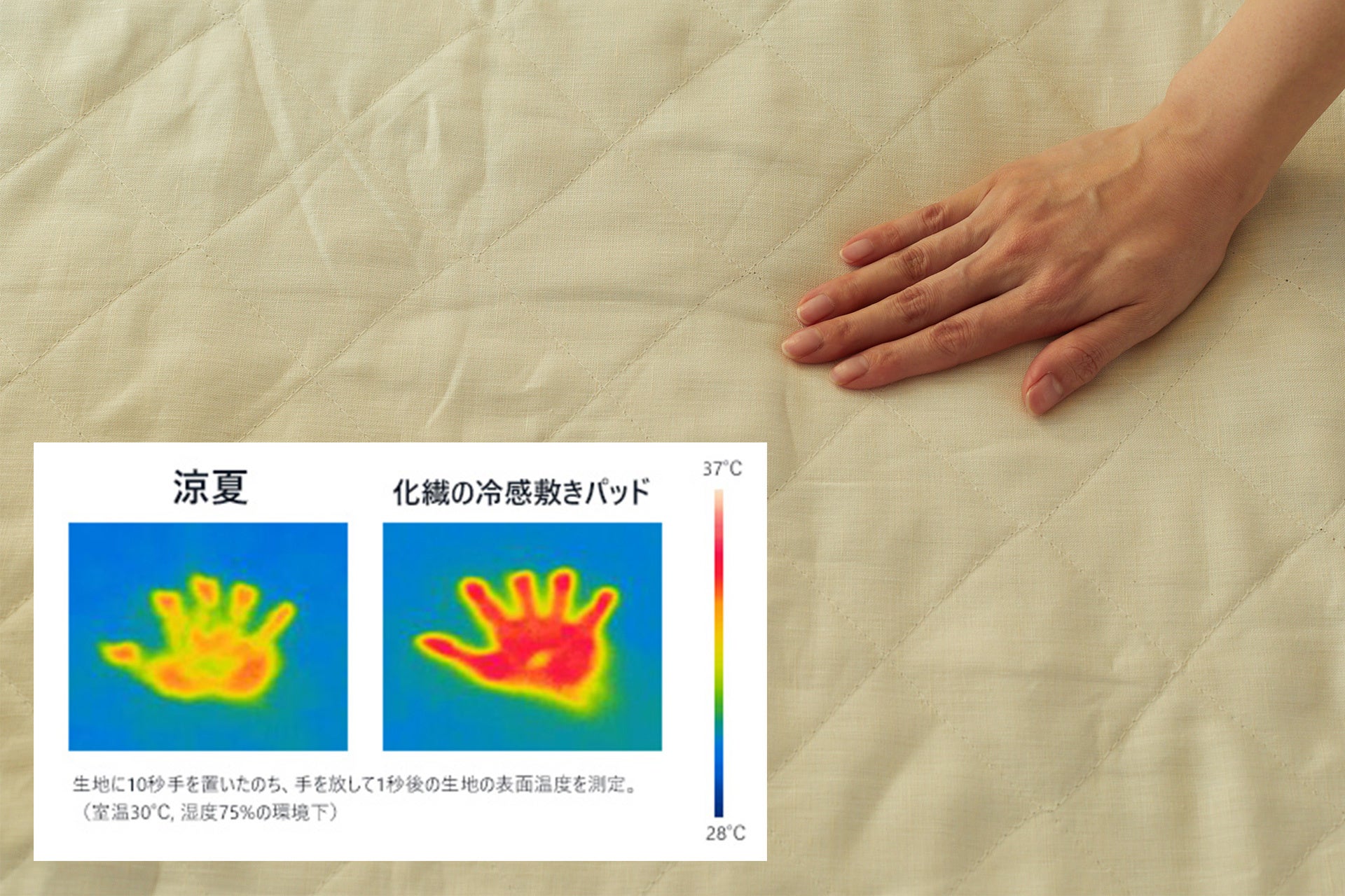 室温30℃, 湿度75%という真夏を再現した環境下で涼夏と化学繊維の接触冷感敷きパッドから手を離した際の生地の表面温度を測定したところ、涼夏の温度が約1℃低いという結果になりました。