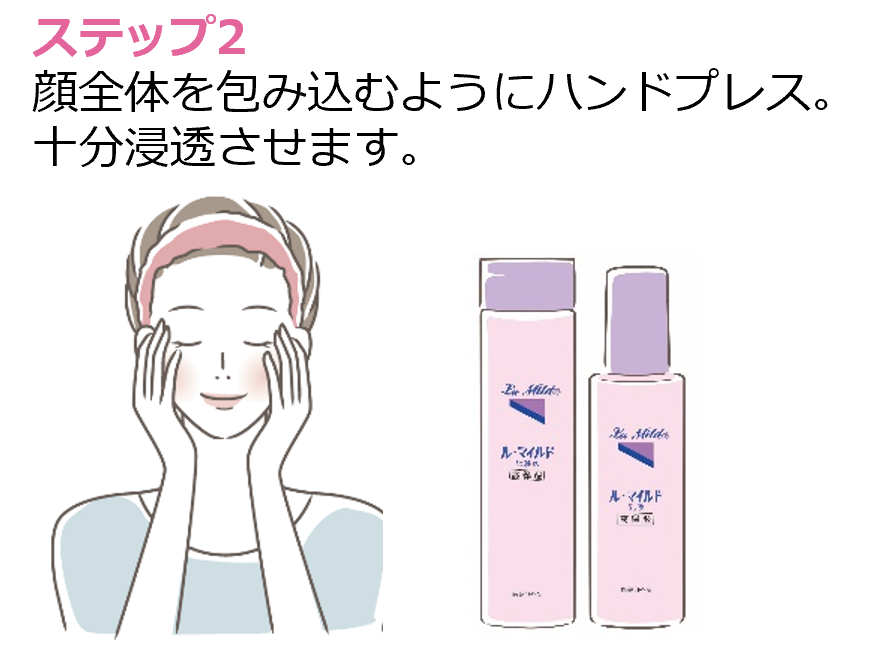 肌が敏感になっている時は、コットンは刺激になります。「ル・マイルド」化粧水・乳液は手にとって、温めながら、やさしくハンドプレスしましょう。簡単2ステップで毎日続けられる保湿ケアが、みずみずしい美しい肌の基盤をつくります。