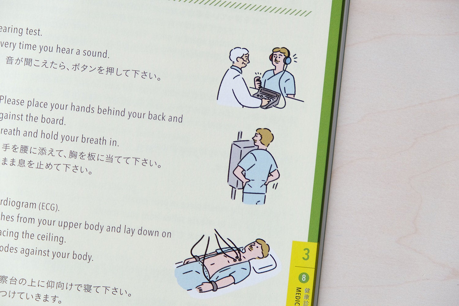 異なる言語でも意思疎通できる医療のコミュニケーションブックを開発しました。130以上のイラストやピクトグラムで図解しています。現在、全国の医療機関・大学800施設以上で導入されています。英語版、中国語版、 やさしい日本語版の三言語を展開中です。