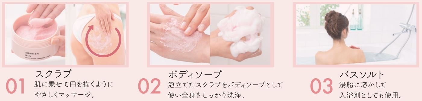 下着による締め付けや長時間のデスクワークなどによっておこるザラつき凸凹や黒ずみケアが毎日のバスタイムで手軽におこなえます。また、泡立てることでデリケートゾーンにも使用できたり、バスソルトとして香りに癒されながらバスタイムを堪能できる多機能なスクラブです。