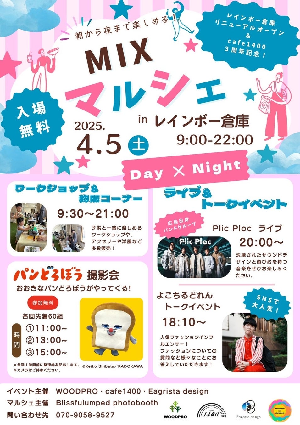 この度、「WOODPROホールディングス(代表取締役 中本敬章 廿日市市峠245−33)」と「cafe1400(代表取締役 藤井正彦 広島市西区商工センター2丁目8-29)」が共催、レインボー倉庫広島のリニューアルを記念して、大人気「パンどろぼう撮影会」をはじめとする、「MIXマルシェ」を開催します【2025年4月5日(土)】