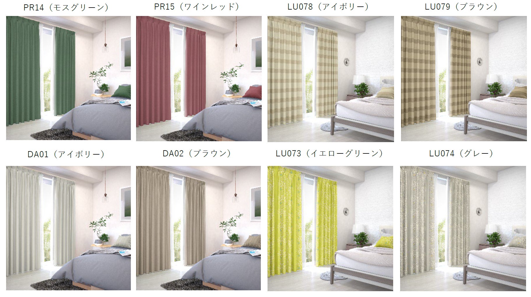 カーテン種類・・・無地(10色)、ボーダー、ストライプ(各2色)、プリント(4色)