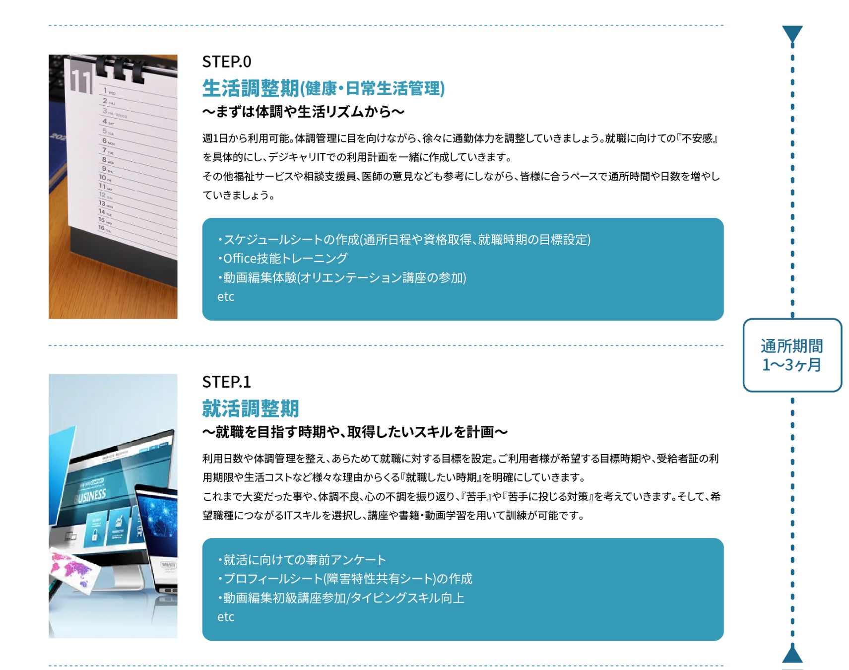 デジキャリITでは、精神障がい・発達障がい・知的障がい・厚生労働省指定難病etc を持つ方を対象とし、就労を続けていく上で欠かせない日常生活スキルの習得、求人募集の多い事務職スキルの習得、時代に合ったIT編集スキルの習得を通して、ご利用頂く方々一人一人へ幅広い就労先を目指したサポートを行わせて頂きます。