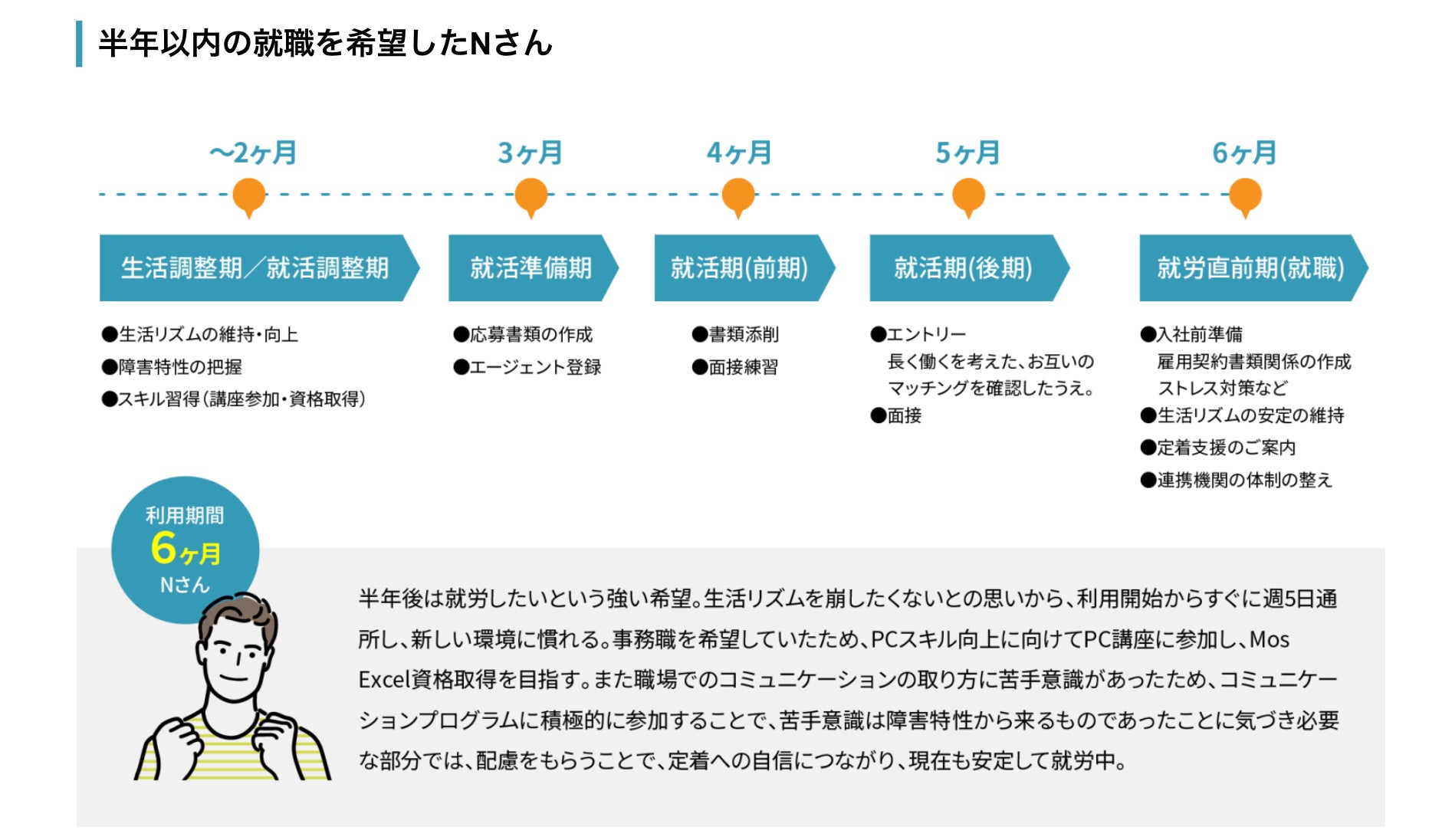 一般企業への就職を目指す障がいのある方(18歳以上〜65歳未満)を対象に、就職に必要な知識やスキル向上のためのサポートを行います。
