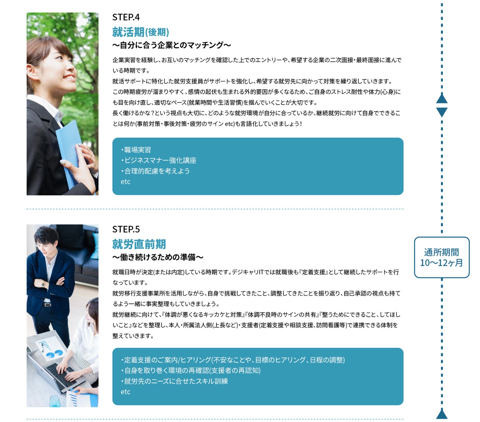 就労移行支援を利用できる期間は原則最大2年間です。2年間の中で、就職するためのスキルを身につけ、自分にあった仕事をみつけていきます。デジキャリITでは、ご本人とスタッフが相談しながら目標に向けて一緒に課題に向き合い就職を目指します。そのため、利用期間も人により様々です。デジキャリITの就職までの利用例です。