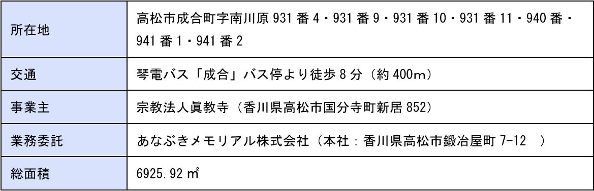この度、400年を超える歴史を誇る真宗興正派 眞教寺(高松市国分寺町)様との共同事業により、多彩なスタイルやニーズにお応えする、これからの時代の新しい霊園のカタチを追求した公園型樹木葬霊園を、高松市成合町にて新規開設する運びとなりました。高松市役所からも車で14分と、気軽に行ける好立地に位置しており、眞教寺様と当社グループが互いに手を組み、お客様へ長きに渡る安心をお届けし、地域の社会的課題の解決にも寄与してまいります。