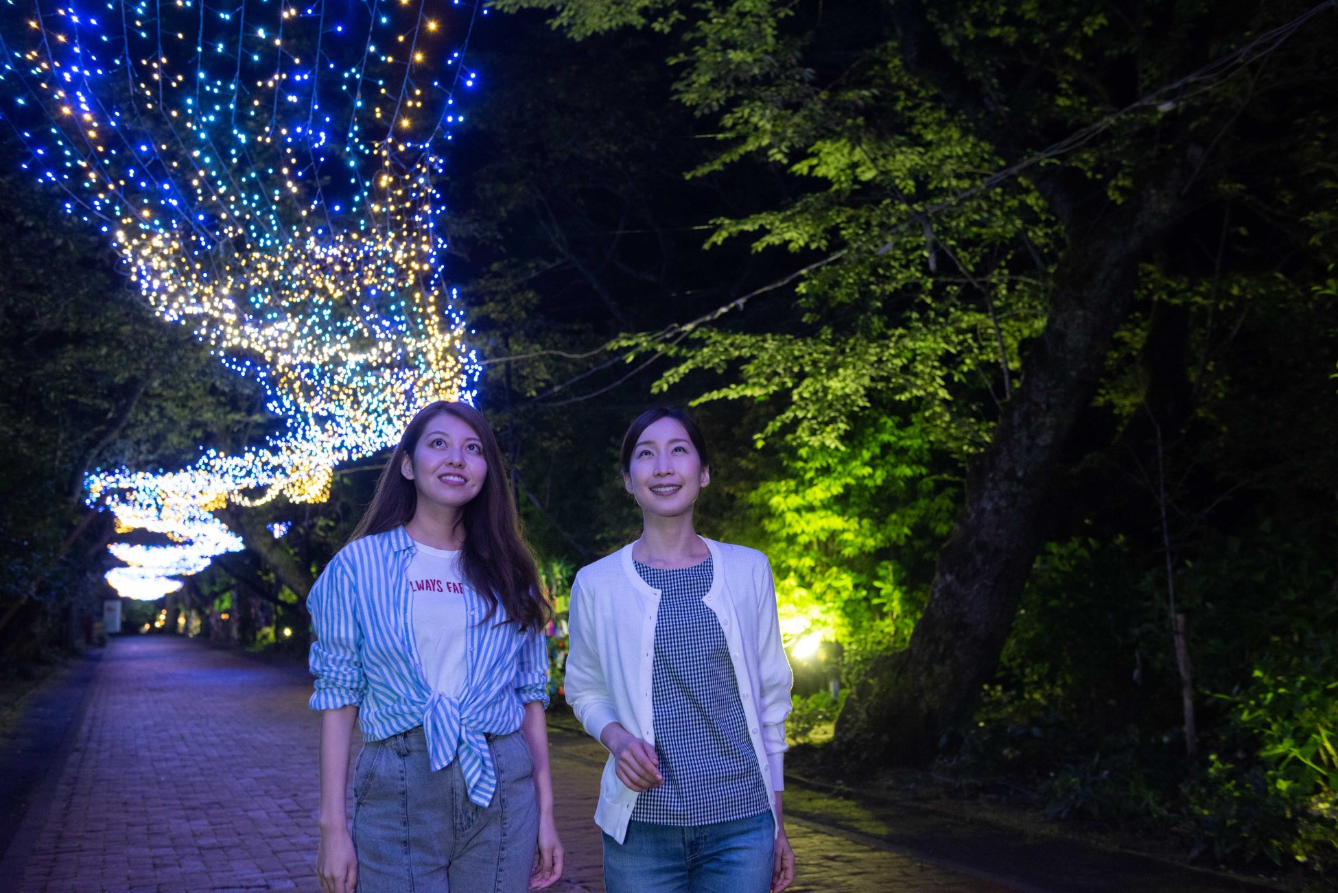 冬のイルミネーションでお馴染みのトンネル約200mが天の川に変わり、夏の夜に涼と彩を添えます。自然の中で煌めくイルミネーションの光と竹灯籠のあたたかな灯りを眺めながら、涼しげな夜の散策を楽しんでみてはいかがでしょうか。
