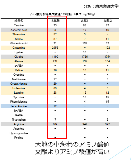 味にも自信があります。養殖用汎用水は、大量のミネラルを含み、海老の腸内環境を整え餌の消化吸収を助けて成長を促進します。驚いたことに、アミノ酸が通常の14倍(グルタミン平均値2,900mg/100g)もあることが分かりました。天ぷらや刺身や塩焼き、蒸し物、どのような調理で食べてとてもおいしい海老ができました。このシステムで育成した車海老を「大地の車海老」と名付け、パートナー企業様と連携しブランド化したいと考えています。
